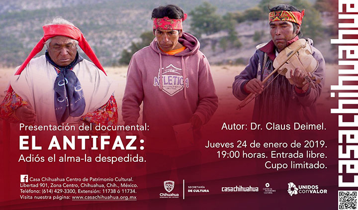 El jueves 24 de enero a las 19:00 horas, se proyectará el documental titulado “El Antifaz: adiós el alma – la despedida” del Dr. Claus Deimel, que muestra la vida de un artista y campesino rarámuri y lo sigue hasta su muerte y su fiesta final ocurrida en enero 2018.