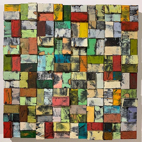 [13 de agosto de 2019, Casa Chihuahua] El maestro Estrada Vega, es originario de Chihuahua, sin embargo desde hace varias décadas reside en Estados Unidos. Su obra está centrada en la figura el cubo, utiliza cientos de cubos de madera en pequeñas dimensiones, para pintarlos con diferentes tonalidades y los va uniendo con imanes, para crear sus majestuosas pinturas.