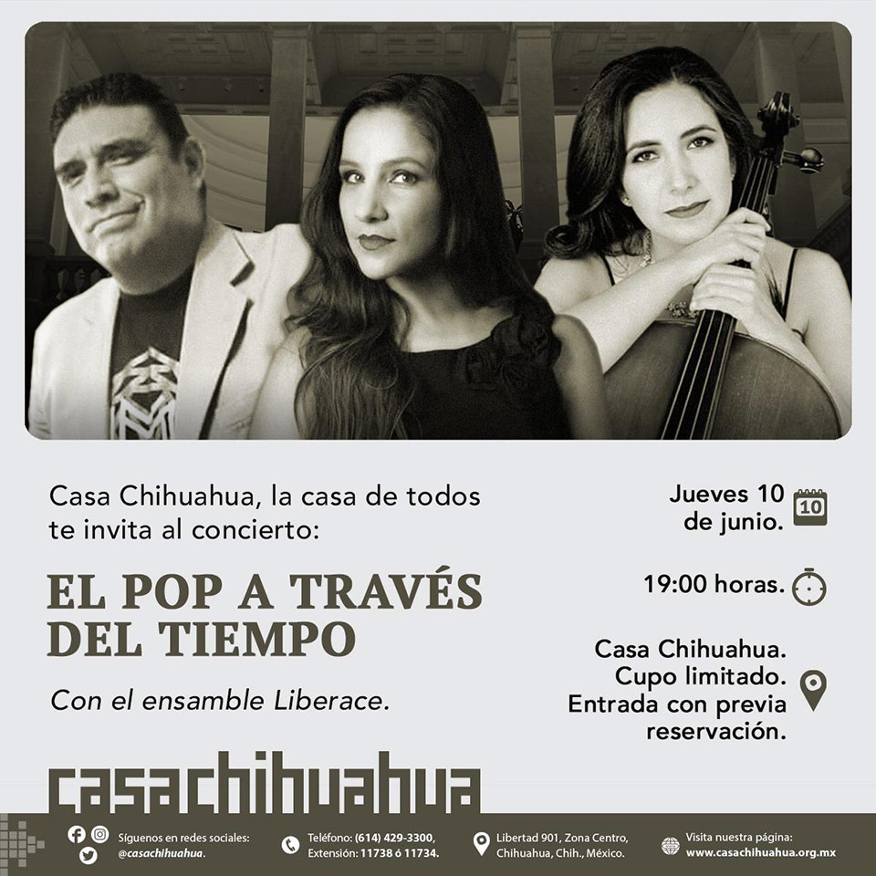 Casa Chihuahua invita a su próximo Jueves de Puertas Abiertas este 10 de junio a las 19:00 horas, para que el público disfrute de un concierto con el ensamble Liberace, que ha preparado una serie de temas pop de todos los tiempos en inglés y español.