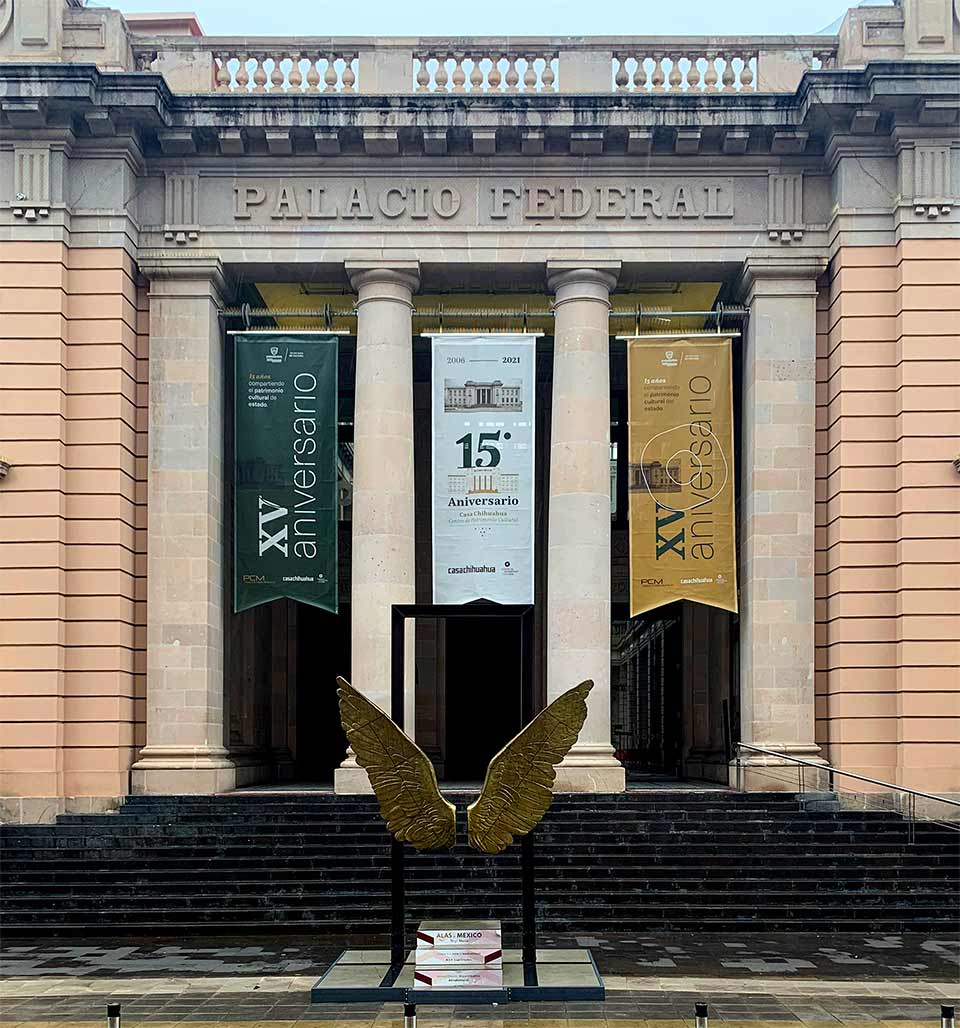 [26 de noviembre de 2021, Casa Chihuahua] Precisamente una de esas obras es Alas de México del escultor mexicano Jorge Marín, que desde Julio de 2020 engalana la entrada principal y ha sido centro de atención para miles de personas que se toman una fotografía en ellas.