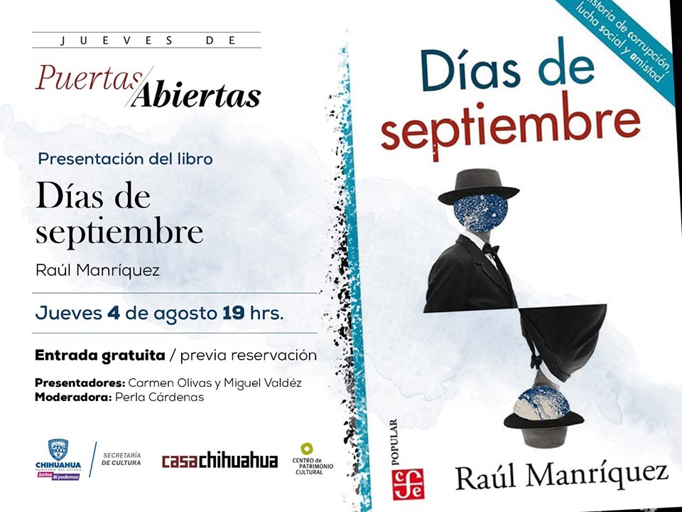 Como parte del programa permanente Jueves de Puertas Abiertas este 4 de agosto a las 19:00 horas se realizará la presentación del libro Días de septiembre del maestro Raúl Manríquez.
