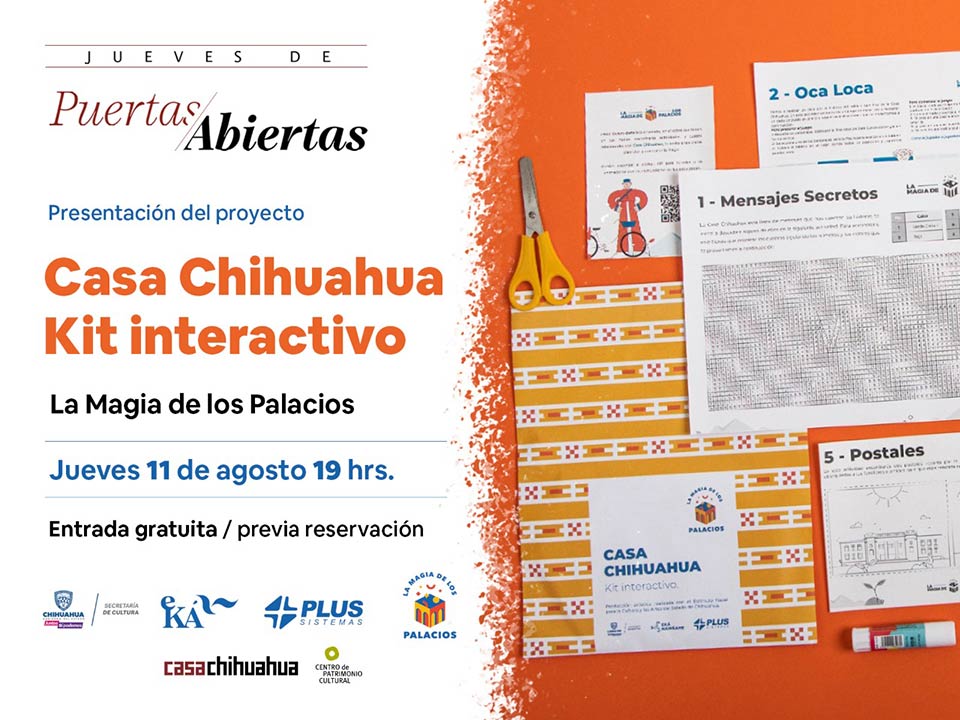 “La Magia de los Palacios” es un kit interactivo que contiene 5 actividades relacionadas con Casa Chihuahua, entre ellas se encuentran un modelo para armar del edificio, una postal para armar del calabozo de Hidalgo, una actividad de pintura para descubrir los mosaicos del piso del edificio, un juego de mesa que narra la historia del inmueble y sus predecesores, además de una serie de postales para que puedan compartir la magia con su familia y amigos.