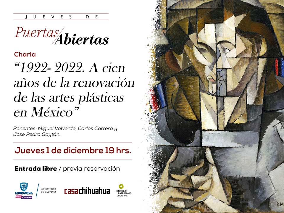 En el marco de la celebración del primer centenario de la modernización de las artes en México 1922-2022, este jueves 1 de diciembre a las 19:00 se impartirá una charla en Casa Chihuahua, con los ponentes Miguel Valverde, Carlos Carrera y José Pedro Gaytán.