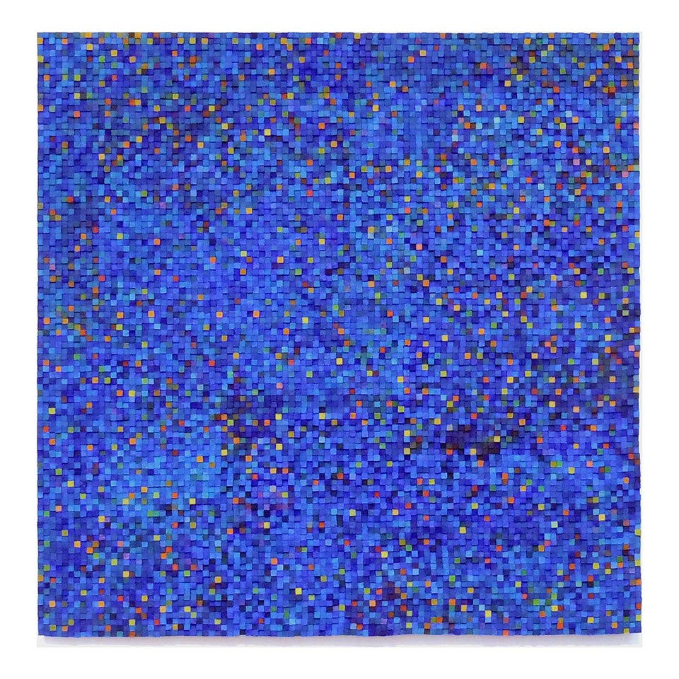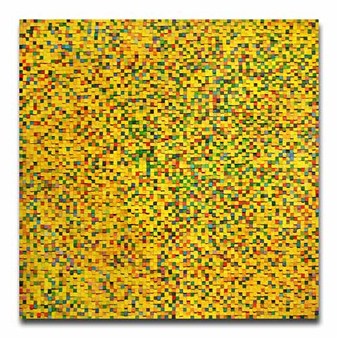 Un cierto sentido de tranquilidad es trascendido al observar a Carlos Estrada-Vega construir sus obras usando cuadros de madera, imanes, metal, y una extensa variedad de colores a través de una mezcla aglutinante muy especial. Los elementos de madera y de pintura son mezclados de una manera constructiva metódica, precisa y como de ritual contemplativo. La aplicación del color a las pequeñas piezas de madera evoca una sensación como del rezo de un salmo trasladado a la acción creadora. Cada pieza, cuyo tamaño puede variar desde una pulgada cuadrada a más grande, es concebida por el pintor como una pintura individual. “Después de alrededor de medio millón de cuadritos, ellos adquieren vida propia”; el artista observa con alivio y satisfacción. Agrega más: “ellos son parte de mí”.